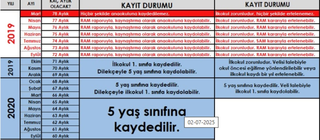 2019 Eylül ayında ve daha öncesinde doğan bir öğrencinin anaokuluna kaydolabilmesi için RAM raporu gerekmektedir, bu yaştakiler sadece RAM raporuyla kaynaştırma olarak kaydolabilir. 2019 Mart ayı ve öncesinde doğan çocuklar RAM raporu alsalar bile hiçbir şekilde anaokuluna kayıt yaptıramazlar.